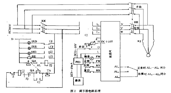 2)技術參數(shù)為:適配電機:M4kw交流電機;輸入電源三相380~415V士10%、50HZ;輸出電壓:三相380~460V、0.5~360HZ;輸出電流:8.6A;重量:0.ekg。1.ZXi作原理本裝置以磷酸根分析儀作為檢測儀表。當爐水中磷酸根含量發(fā)生變化時,磷酸根分析儀送出與磷酸根濃度相對應的0~10mA電流信號.輸入調(diào)節(jié)器巾.與調(diào)節(jié)器巾頂牛設家的磷酸圖1加藥控制框圖根濃度進行比較,將控制信號輸出至變頻器,后者按控制信號的大小將三相380V、50Hz交流電源變?yōu)橄鄳l率及電壓的三相電源,送至交流電機,以改變電動機轉速,從而改變往復泵的往復頻率,使爐水的磷酸根濃度保持在設定范圍內(nèi)。自動磷酸鹽加藥裝置采用兩臺控制儀及三臺加藥泵。1號、3號磷酸鹽泵常開,2號泵備用。當1、3號泵出現(xiàn)故障時,可通過控制柜上的轉換開關啟動備用泵向爐內(nèi)加藥,同時設有自動/手動切換開關,當自動調(diào)節(jié)系統(tǒng)出現(xiàn)故障時,可切換至手動。電路原理如圖2所示(以2號爐為例)。2系統(tǒng)調(diào)校2·1參數(shù)設定參數(shù)設定對自動調(diào)節(jié)系統(tǒng)投入運行十分重要。設定恰當與否將直接影響自動調(diào)節(jié)的效果,但由于影響磷酸根濃度的因素較多,難以準確測試,因而采用經(jīng)驗法對系統(tǒng)參數(shù)進行設定。1)磷酸鹽泵行程未裝自動調(diào)節(jié)時,磷酸鹽泵行程一般調(diào)節(jié)在30%~50%之間即可達到機組對磷酸根濃度的要求,因此取50%行程。2)調(diào)節(jié)器參數(shù)由于磷酸根濃度是一多容且滯后大的對象,初始PID設定為:6取80呢、T;。担恚椋、Tn取lmin、采樣周期4min。3)變頻器參數(shù)最低頻率:10HZ;最高頻率:50HZ。