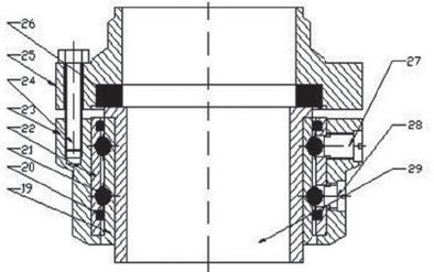 在圖中,1支柱,2連接件,3連接件,4旋轉(zhuǎn)器,5短管,6鎖緊裝置,7連接件,8連接件,9軸承盒,10旋轉(zhuǎn)器,11彎頭管件,12旋轉(zhuǎn)器,13連接板,14平衡器,15連接件,16升降管,17旋轉(zhuǎn)器,18垂管,19軸承內(nèi)套,20密封環(huán),21工業(yè)陶瓷滾珠,22軸承外套,23軸承盒,24螺釘,25蓋,26密封圈,27螺紋堵,28螺紋堵,29管件,30短接,31彎頭管件,32彎頭管件,33彎頭管件,34彎頭管件,35連接管,36彎頭管件,37入口短接。圖1中,連接件(3)、入口短節(jié)(37)、旋轉(zhuǎn)器(4)、彎頭管件(36)、短管(5)、彎頭管件(34)、旋轉(zhuǎn)器(10)、彎頭管件(11)、旋轉(zhuǎn)器(12)、彎頭管件(33)、升降管(16)、彎頭管件(32)、旋轉(zhuǎn)器(17)、彎頭管件(31)、垂管(18)、短節(jié)(30)進(jìn)行焊連接;彎頭管件(33)處焊接一連接板(13),升降管(16)上焊有一連接件(15),平衡器(14)用銷釘連接于連接板(13)和連接件(15)之間;彎頭管件(36)、連接管(35)、軸承盒(9)、連接件(8)進(jìn)行焊連接;支柱(1)的上部和下中部分別焊有連接件(2)、連接件(7);連接件(2)和連接件(3)、連接件(7)和連接件(8)分別用螺栓連接;支柱(1)和連接管(35)之間設(shè)有鎖緊裝置。