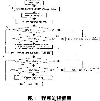 2數(shù)值計算方法對于(7)式,i=n—1時,只有Qn-t.Qn兩個未知量,對Q”賦初值,通過迭代解(7)式可求得Qi,如此從后至前,依次遞推,可求得各分支管路的流量、泵流量及沿程總摩阻,將求得的結果代入(4)式校核,若沿程摩阻大于泵揚程,則減小Q的值,反之,則增大Qn,如此反復,直至沿程總摩阻與泵揚程的差值在給定精度范圍內(nèi),退出循環(huán)。按以上計算思路編程,主要計算程序框圖如圖1所示。