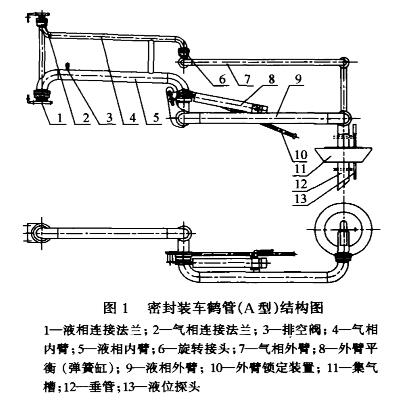 目前國(guó)內(nèi)常用的密閉裝車鶴管圖1和圖2所示A型和B型是目前國(guó)內(nèi)常見的兩種鐵路、公路槽車頂部密封裝車鶴管。兩種產(chǎn)品均由2臺(tái)單管裝載臂的管系組合而成,其中,直徑稍大的管系用于液相傳輸,直徑稍小的1臺(tái)用于返回油氣。通過國(guó)內(nèi)外數(shù)年的制造和使用,總體反映的情況是結(jié)構(gòu)尺寸偏大,操作不便。對(duì)A型而言,2個(gè)管系上下獨(dú)立布置,設(shè)備的總體尺寸偏高,特別是垂管只能做空間平動(dòng),操作時(shí)顯得笨重和呆滯。對(duì)B型而言,由于B型的2個(gè)外臂采用水平布置,垂管可以自由轉(zhuǎn)動(dòng),操作時(shí)相對(duì)靈活,但由于橫向尺寸較大,操作時(shí)不得力,特別是在復(fù)位狀態(tài)時(shí),臂的外緣容易接近或超越機(jī)車限界而影響安全,因此經(jīng)常不被采用。