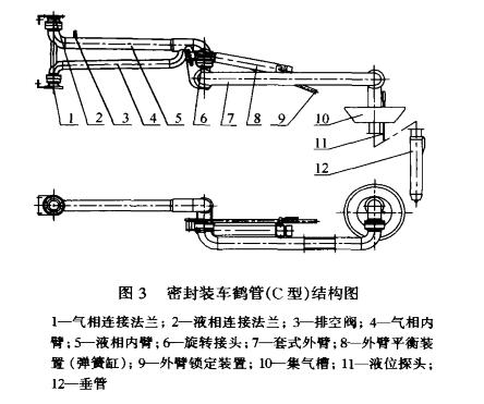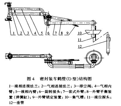 套管式密閉裝車鶴管圖3和圖4所示C型和D型是套管式密封裝車鶴管,是在原密封裝車鶴管的基礎(chǔ)上,它繼承了單管臂的優(yōu)點(diǎn),克服了雙管臂(A型和B型)的缺點(diǎn),無(wú)明顯缺陷,屬于目前先進(jìn)的密封裝車技術(shù)。套管式密閉裝車鶴管設(shè)計(jì)合理,采用同心管結(jié)構(gòu)(內(nèi)管為液相管、外管為氣相管),雙管合一,結(jié)構(gòu)尺寸與單管臂相同,體積小,操作起來(lái)輕便靈活,沒有制肘,成年人一根手指就能推拉。它采用套管式旋轉(zhuǎn)接頭技術(shù),使得內(nèi)外管和旋轉(zhuǎn)接頭使用同一個(gè)旋轉(zhuǎn)中心,無(wú)同軸和平行度要求,易于保證制造質(zhì)量。