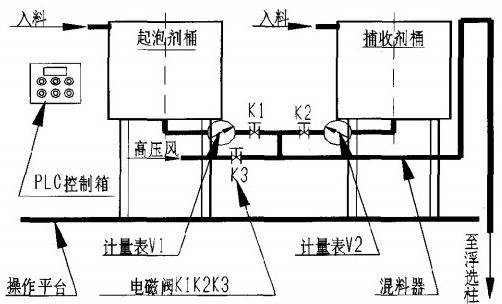 ②用小油泵B1、B2分別將兩種藥劑從兩個小藥劑桶底部接計(jì)量表V1、V2,通過微機(jī)自動調(diào)節(jié)計(jì)量表V1、V2調(diào)節(jié)藥劑的配比。打開電動閥門K1、K2,兩種藥劑按一定配比自流到混料器內(nèi)充分混合。計(jì)量表V1、V2的調(diào)節(jié)及電動閥門K1、K2的開閉通過微機(jī)操作。
