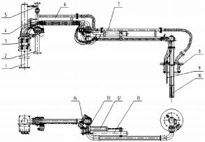 裝車鶴管的原理:對(duì)于裝載易揮發(fā)介質(zhì),鶴管設(shè)液相和氣相兩條管線,裝車時(shí)液相介質(zhì)從液相管道進(jìn)入槽車,揮發(fā)油氣及罐內(nèi)的空氣從氣相管線進(jìn)入油氣回收裝置中進(jìn)行回收處理實(shí)現(xiàn)達(dá)標(biāo)排放,鶴管的內(nèi)外臂的伸展及收攏、外臂的上仰及下俯都通過氣動(dòng)控制系統(tǒng)控制,在設(shè)計(jì)的裝車空間范圍內(nèi)實(shí)現(xiàn)任意位置裝車。