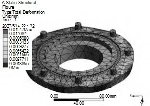 為了便于分析,設(shè)計采用了Solidworks中Work-bench模塊。接頭中金屬材料選用不銹鋼材料,網(wǎng)格劃分的大小設(shè)置為3mm長度,其中外法蘭盤劃分效果如圖4所示。