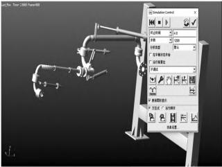 將裝卸鶴管中各物體連接關(guān)系以及驅(qū)動設(shè)置好之后即進(jìn)行運(yùn)動仿真,運(yùn)動時間為4s,運(yùn)動步數(shù)為1200步,仿真界面如圖8所示。