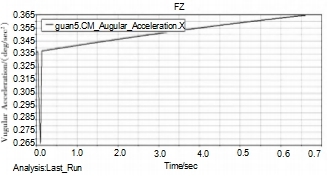 為了確保所設(shè)計自主補(bǔ)油裝卸鶴管的安全、有效,設(shè)計中基于adams軟件進(jìn)行了運(yùn)動仿真,并對裝卸鶴管末端關(guān)節(jié)的位移、速度和角加速度進(jìn)行分析。圖9給出了相應(yīng)的位移、速度和角速度曲線。由位移圖可以看出,前2s之內(nèi)線性位移值為X軸從-2800~-2200,總位移量為600mm,呈對稱變化,后2s內(nèi)平穩(wěn)運(yùn)動;由速度圖可以看出,末端關(guān)節(jié)大線性速度為每秒500mm,在經(jīng)過約2s后趨于穩(wěn)定,前2s內(nèi)速度在正負(fù)值每秒500mm區(qū)間波動,后2s停止運(yùn)動,速度趨近于0;由角速度圖可以看出,角加速度一開始劇烈的下降到0.264°/(m2·s),0.1s之后緩速直線上升,趨于穩(wěn)定。