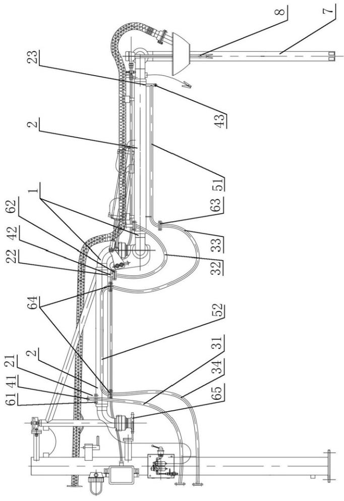 1鶴管主管;2夾套管;21蒸汽進(jìn)口;22,23蒸汽出口;31,32,33,34蒸汽軟管;41,42,43短管;51,52直鋼管;61,62,63,64,65法蘭;7垂管;8叉音探頭;