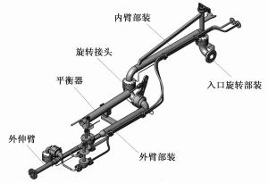 低溫鶴管主要由入口旋轉(zhuǎn)部裝、內(nèi)臂部裝、外臂部裝、外伸臂、平衡器、旋轉(zhuǎn)接頭及附件組成(見(jiàn)圖1)。旋轉(zhuǎn)接頭是實(shí)現(xiàn)低溫鶴管運(yùn)動(dòng)旋轉(zhuǎn)的關(guān)鍵核心部件;入口旋轉(zhuǎn)部裝直接與撬裝管道相連接,是運(yùn)輸介質(zhì)的入口通道;外伸臂則直接與汽車(chē)槽車(chē)的儲(chǔ)罐相連,構(gòu)成運(yùn)輸介質(zhì)的出口通道;內(nèi)臂部裝與撬裝框架連接,是低溫鶴管左右旋轉(zhuǎn)運(yùn)動(dòng)的關(guān)鍵部件;平衡器主要起到平衡外臂及外伸臂轉(zhuǎn)動(dòng)力矩的作用,主要有配重式、彈簧缸、氣缸式等多種樣式,其中以配重式和彈簧缸式較為常見(jiàn)。