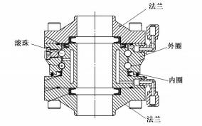 低溫鶴管旋轉(zhuǎn)接頭是主要用于連接低溫鶴管的不同組件做相對(duì)旋轉(zhuǎn)并能承受一定載荷的部件,是關(guān)系到低溫鶴管是否能夠穩(wěn)定運(yùn)動(dòng)的關(guān)鍵核心部件。旋轉(zhuǎn)接頭結(jié)構(gòu)圖如圖2所示。低溫旋轉(zhuǎn)接頭主要由動(dòng)密封法蘭、靜密封法蘭、密封墊、內(nèi)圈、外圈、滾珠等組成。當(dāng)?shù)蜏匦D(zhuǎn)接頭兩端組件做旋轉(zhuǎn)運(yùn)動(dòng)時(shí),內(nèi)外圈間的滾珠隨之滾動(dòng),起到減小摩擦阻力的作用。