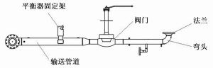 外臂部裝主要由法蘭、彎頭、閥門(mén)、輸送管道和平衡器固定架組成(見(jiàn)圖4)。外臂部裝可在水平面和垂直面的范圍內(nèi)轉(zhuǎn)動(dòng),主要用于調(diào)整鶴管同槽車(chē)對(duì)接工作位置。