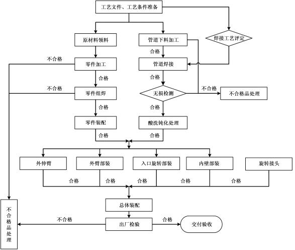 低溫鶴管一般生產(chǎn)工藝流程如圖6所示。在低溫鶴管總體裝配過(guò)程中,除平衡器后安裝外,一般遵循由內(nèi)向外、先主后次的安裝順序,即從入口旋轉(zhuǎn)部裝開(kāi)始,逐步向外伸臂安裝,先裝配主管道,后裝配支管道及附件。在裝配彈簧缸式平衡器過(guò)程中,應(yīng)先按圖樣所示角度安裝好彈簧缸安裝板,將彈簧缸一端固定在安裝板后,緩慢向上旋轉(zhuǎn)外臂部裝至適當(dāng)角度后,使彈簧缸外部定位柱順利安裝入卡槽中,終再調(diào)整外臂角度使彈簧缸安裝牢固。