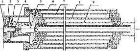 其工作原理如圖:行走小車在行走汽缸驅(qū)動(dòng)下,帶動(dòng)整套裝置沿桁架做一定距離的往復(fù)運(yùn)動(dòng),以適應(yīng)油罐位置的變化。當(dāng)鎖緊汽缸進(jìn)氣,如圖2所示,將頂銷1壓下,其下部錐面頂開鎖緊套4,掛桿5隨同四級(jí)汽缸一道在氣壓驅(qū)動(dòng)下推動(dòng)密閉大蓋及導(dǎo)油鶴管一級(jí)一級(jí)降下(輸油汽管箱掛在汽缸9下端,密閉大蓋與輸油汽管箱外層相連,導(dǎo)油鶴管與輸油汽管箱內(nèi)層相連,掛桿5下端連接鋼絲繩,吊住鶴管外層一節(jié)),使密閉大蓋封住油罐頂部入口,多節(jié)式導(dǎo)油鶴管再逐節(jié)下落,伸入罐底,以實(shí)現(xiàn)液下裝車(液下裝車能使油汽揮發(fā)僅為液面裝車的20%左右)。輕油由輸油汽管箱左邊管道進(jìn)入輸油汽管箱內(nèi)層,揮發(fā)油汽則通過輸油汽管箱內(nèi)外層之間的夾縫由右邊的管道輸出。目前采用的吸咐回收和冷凝回圖1HMZ-100/2.4輕油密閉裝車裝置示意圖