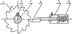 如圖5所示,用一個(gè)小型單作用汽缸和棘輪棘爪機(jī)構(gòu)實(shí)行鎖緊。棘輪1裝在繩輪軸3上,棘爪4與活塞連成一體。當(dāng)裝車完成后,繩輪機(jī)構(gòu)將鶴管完全提上來,小汽缸放氣,在壓縮彈簧的作用下,棘爪4伸出,阻止棘輪反向轉(zhuǎn)動(dòng),即可達(dá)到鎖緊目的。