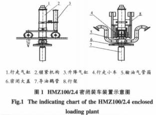 密閉裝車鶴管裝置如圖1所示,主要由五大部分組成:行走小車、升降氣缸、導(dǎo)油鶴管、密閉大蓋、輸油氣管箱。