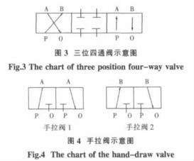 當(dāng)閥處于左邊位置時(shí),氣源由P經(jīng)B進(jìn)入氣缸,推動活塞運(yùn)動,被擠壓空氣由A經(jīng)O進(jìn)入大氣排出,當(dāng)打到中間位置時(shí),由于進(jìn)氣部分空氣未排出,氣體將繼續(xù)推動活塞向前運(yùn)動一小段時(shí)間,導(dǎo)致行走小車不能在瞬間停住,從而很難達(dá)到理想的?课恢,改進(jìn)后,采用兩個(gè)手拉閥予以控制,見圖4,當(dāng)氣源由P經(jīng)A進(jìn)入氣缸,氣壓推動活塞運(yùn)動,被擠壓空氣由B經(jīng)O進(jìn)入大氣排出,當(dāng)打到中間拉置時(shí),氣源被隔離開,前面進(jìn)氣部分空氣由A經(jīng)O進(jìn)入大氣層,氣缸活塞兩端壓差為0,活塞隨即停止運(yùn)動,氣缸?糠浅<皶r(shí)、準(zhǔn)確、可靠。