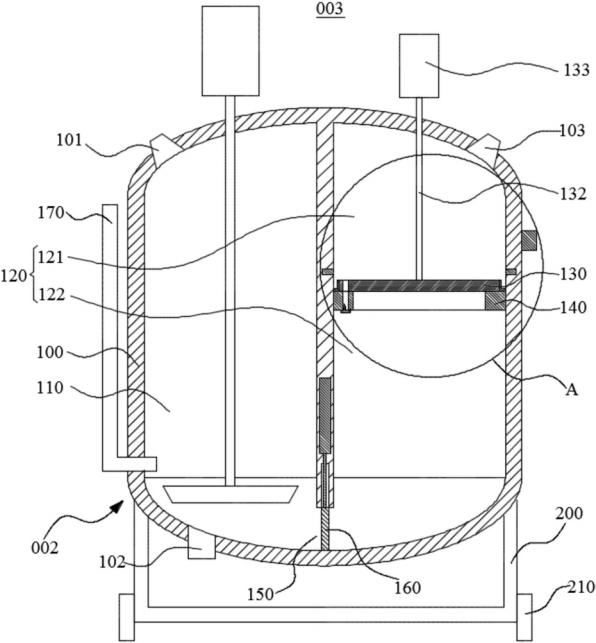 圖中:001-加藥裝置;002-加藥裝置;003-加藥系統(tǒng);100-加藥罐本體;101-進(jìn)水口;102-排液口;103-進(jìn)藥口;110-一腔;120-二腔;121-三腔;122-四腔;130-隔板;131-開口;132-驅(qū)動(dòng)軸;133-旋轉(zhuǎn)電機(jī);140-擋板;141-加藥口;142-密封蓋;143-彈簧;150-通道;160-密封板;170-液位計(jì);180-密封圈;190-控制組件;191-紅外線發(fā)射器;192-紅外線接收器;200-支架;210-滾輪。