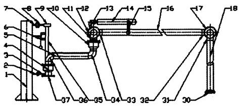 圖1中,連接件(3)、入口短節(jié)(37)、旋轉(zhuǎn)接頭(4)、彎頭管件(36)、短管(5)、彎頭管件(34)、旋轉(zhuǎn)接頭(10)、彎頭管件(11)、旋轉(zhuǎn)接頭(12)、彎頭管件(33)、升降管(16)、彎頭管件(32)、旋轉(zhuǎn)接頭(17)、彎頭管件(31)、垂管(18)、短節(jié)(30)進(jìn)行焊連接;彎頭管件(33)處焊接一連接板(13),升降管(16)上焊有一連接件(15),平衡器(14)用銷釘連接于連接板(13)和連接件(15)之間;彎頭管件(36)、連接管(35)、軸承盒(9)、連接件(8)進(jìn)行焊連接;支柱(1)的上部和下中部分別焊有連接件(2)、連接件(7);連接件(2)和連接件(3)、連接件(7)和連接件(8)分別用螺栓連接;支柱(1)和連接管(35)之間設(shè)有鎖緊裝置。