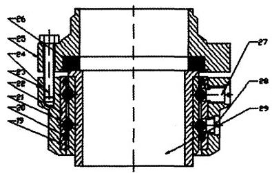 圖2中,軸承外套(22)設(shè)置在軸承盒(23)內(nèi),并在上下內(nèi)側(cè)兩個(gè)槽內(nèi)各設(shè)有密封環(huán)(20);管件(29)設(shè)置在軸承內(nèi)套(19)內(nèi),組裝好后插入軸承外套(22)內(nèi)側(cè),工業(yè)陶瓷滾珠(21)通過(guò)軸承盒(23)上的兩個(gè)孔裝入軸承中,用螺紋堵(27)(28)通過(guò)螺紋封好,管件(29)、密封圈(26)、蓋(25)按順序設(shè)置,用螺釘(24)通過(guò)蓋(25)的螺栓孔插入同軸承盒(23)的螺紋孔緊固連接。