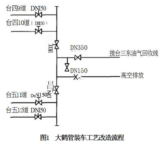 密封蓋內(nèi)密封圈、密封板等部件的使用壽命一般為3年。臺四密封蓋已使用將近6年,建議將密封蓋內(nèi)密封圈及密封板進行更換,并對密封蓋上油氣出口進行改造,使用DN150的出氣口和DN150的油氣金屬軟管。建議重新鋪設(shè)油氣回收線,從臺四、臺五中間鋪一根DN300或DN350油氣回收線與臺三東油氣回收主線相連接,并在臺四、臺五的油氣出口線上各安裝高空排放口以利于油氣排放(1)。改造后的工藝流程圖見圖1。