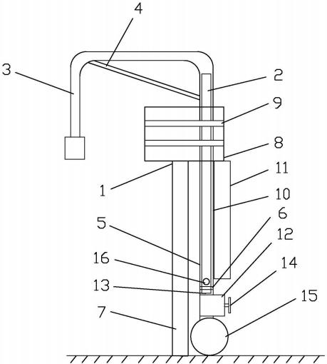 圖中,1——操作臺;2——瀝青豎直管道;3——鶴管;4——支撐桿;5——外管;6——旋轉(zhuǎn)連接器;7——支撐柱;8——平臺;9——欄桿;10——梯子;11——保護(hù)欄桿;12——閥門;13——瀝青排出管;14——手輪;15——瀝青管道;16——扳手。